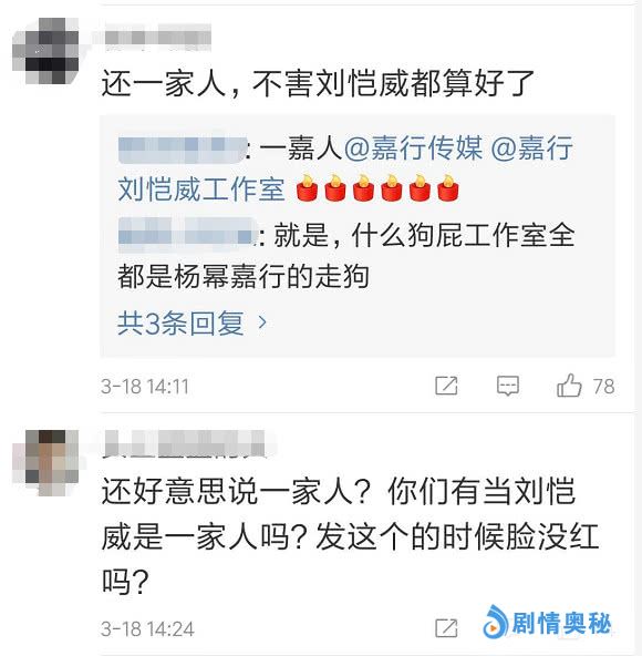 而在嘉行传媒的官微发布这条动态后,刘恺威方面也透过微博“嘉行刘恺威工作室”转发了这条微博,并用“一嘉人”3个字称呼杨幂工作室,主动向杨幂方示好。正是因为这个行为,才招致不小的争议,甚至有不少刘恺威的粉丝在微博下留言痛骂:“还一家人,不害刘恺威都算好的了”。