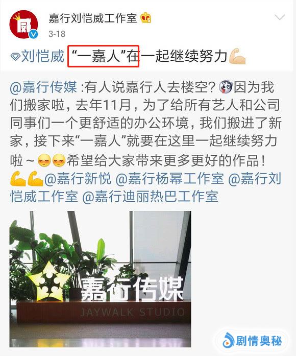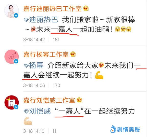 实际上在刘恺威工作室转发这条微博后,杨幂和旗下艺人迪丽热巴的工作室也转发了该微博,并一律用“一嘉人”互称对方的工作室,而且还互相打气,说要“加油”。因为嘉行传媒目前旗下最具知名度和影响力的三位艺人,就是刘恺威、杨幂以及迪丽热巴了。再加上三家工作室都同属于嘉行传媒这个整体,所以说是“一家人”也没有任何错。