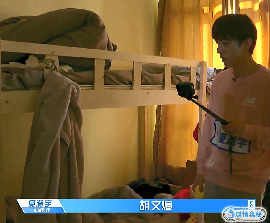他首先来到自己的宿舍,在宿舍里绕了一圈,他还是先走到最温柔可爱的胡春杨床边。只见他轻轻了戳了胡春杨的手臂几下,杨杨在看到摄像头后,迷迷糊糊地坐起来,看清周围很多人后,立刻用被子遮脸,害羞的小动作瞬间逗乐了夏瀚宇。在离开之前还温声细语地对他说“等会自己去化个妆什么的”,说完就转向另一边喊胡文煊。