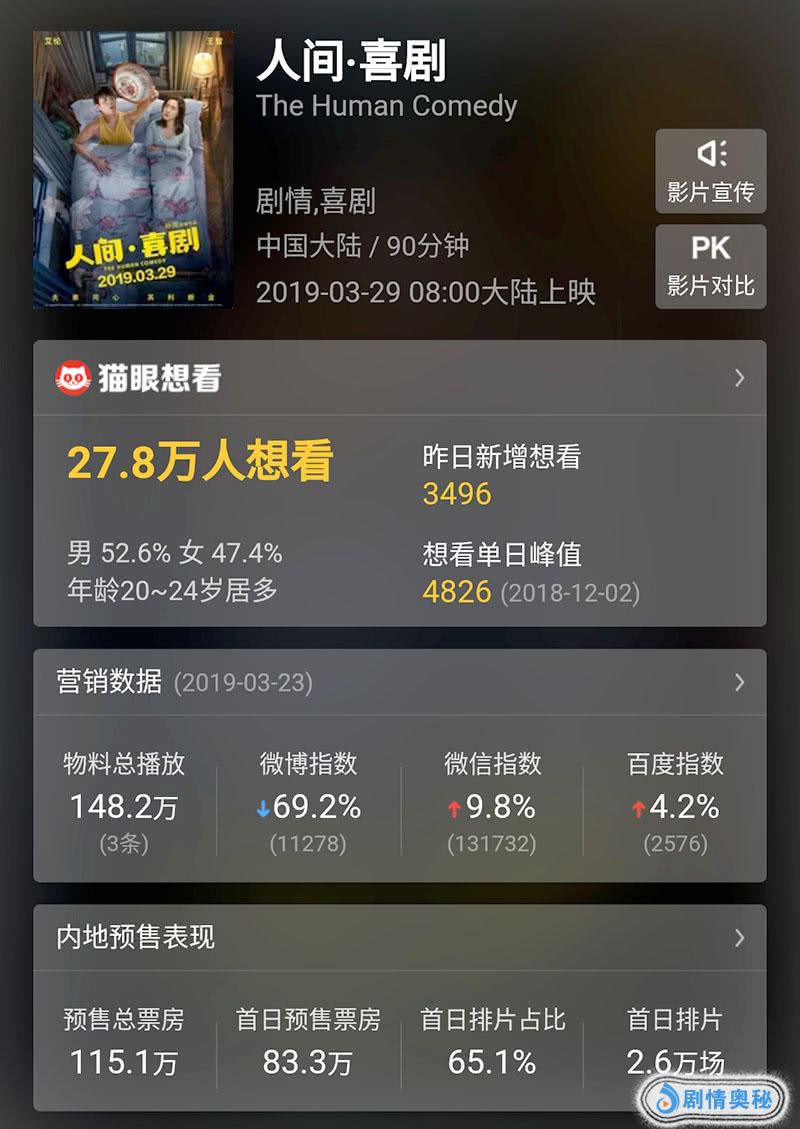 还有几天时间,开心麻花成员艾伦的电影《人间·喜剧》就要上映了,从票房专业数据来看,截止到发稿时间,该片预售总票房超过了115万,首映当日预售票房达到83.3万,首日排片占比更是过了半数,另外也有27.8万人对该片有兴趣。