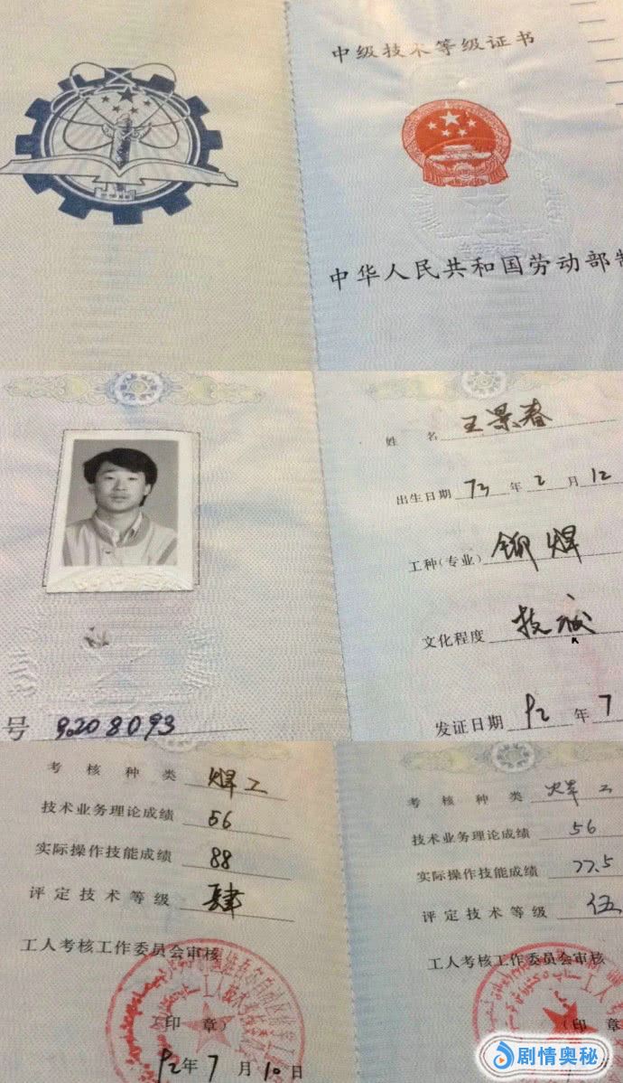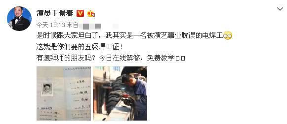 25日中午,王景春在微博上发文晒出自己的五级焊工证,并发文:“是时候跟大家坦白了,我其实是一名被演艺事业耽误的电焊工,这就是你们要的五级焊工证!”这个焊工证晒得颇为高调哈。
