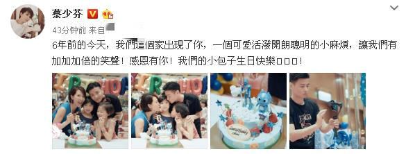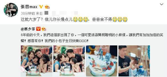25日下午,蔡少芬在微博上发文:“6年前的今天,我们这个家出现了你,一个可爱活泼开朗聪明的小麻烦,让我们有加加加倍的笑声!感恩有你!我们的小包子生日快乐!”并配了四张照片,随后张晋转发了这条微博,却被网友调侃:老父亲一枚。