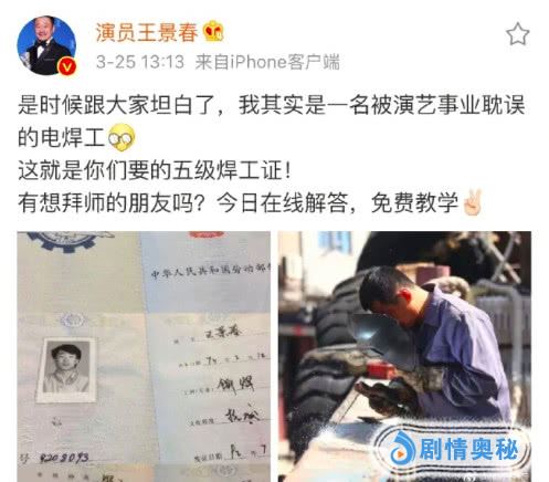 不仅把采访变成了电焊讲座科普,王景春今天还在微博晒出了自己的五级电焊技工证,绝对的实力选手。有这样的硬核演员来演戏,导演估计也会笑醒吧。很赞!