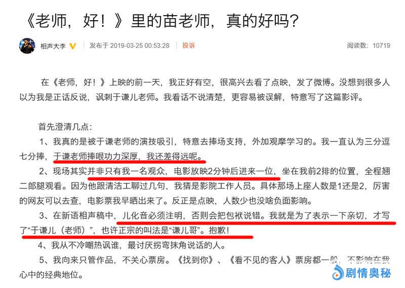 而这部电影的上映,让交大相声博士李宏烨再次进入到了观众的视线当中,他在个人媒体平台发布“包场”电影院的照片,以及文中两次“于谦儿”的书面称呼,受到了很多网友的口诛笔伐,称其暗讽《老师·好》票房惨淡,同时对于谦的称呼也被认为不妥。