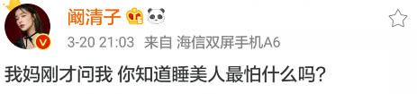 然而在近日,阚清子在被曝出新恋情后,更新微博疑似与谢彬彬首秀恩爱,3月20号晚,阚清子更新微博发文称“我妈刚才问我,你知道睡美人最怕什么吗?”引发外界对阚清子与新男友谢彬彬秀恩爱的嫌疑,这条微博看似是阚清子与妈妈之间的聊天对话,实则是阚清子暗戳与男友撒狗粮。