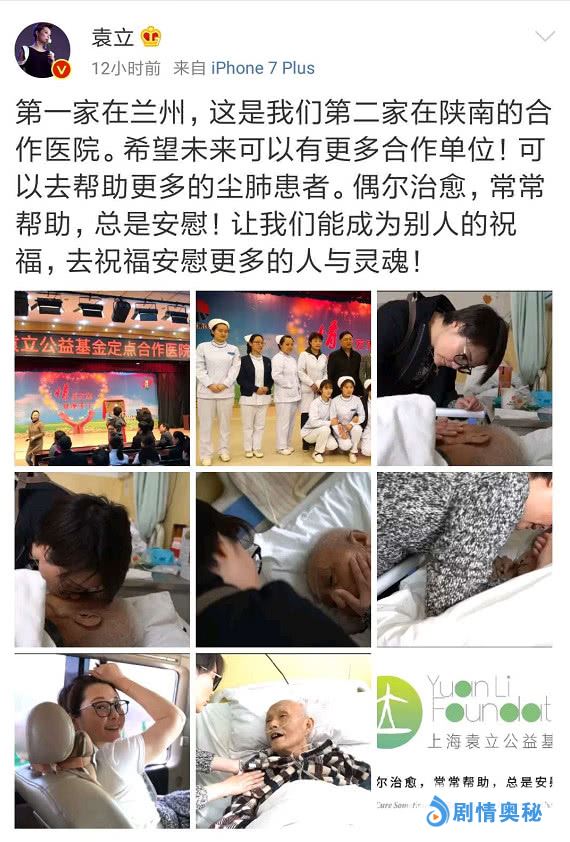 3月25日上午10时许,袁立在微博上晒出一组照片,照片内容为她近日到访陕西某医院探望尘肺病患者的现场记录照片。当天,她以“上海袁立公益基金会”创始人的身份,与该医院达成了合作计划,并在现场举行了揭牌活动。
