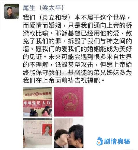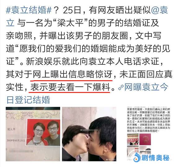 或许是为了进一步证明自己并没有撒谎,这位名叫梁太平的网友,还在晒出结婚证的基础上特意附上了自己和袁立的亲吻照,看上去的确像是伴侣的样子。