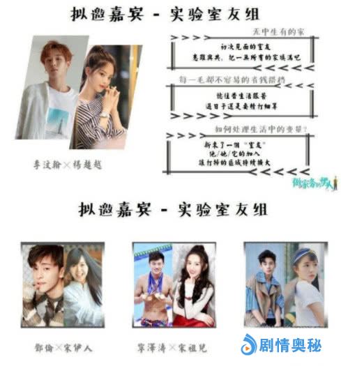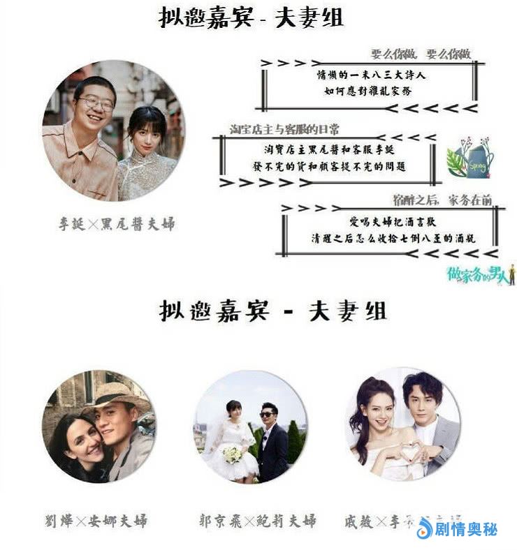 《做家务的男人》预计将会在第三季度播出,当然这档节目相应的嘉宾阵容以及出来,分为夫妻组、母子组、实验组等三组类型的嘉宾。