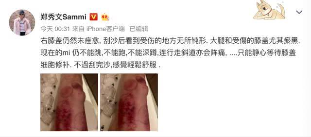 当然,也希望郑秀文的脚伤早日康复,其实她压力非常大,离演唱会的举办也没几个月了,而她现在状况她自己也说了,不要说运动,就是一般行走都会隐隐作痛,看着真的让人心疼,尤其是她晒出的刮痧图片,也只能再次希望她早日痊愈,以最好的姿态与状态呈现,但也真的不要再勉强自己了。