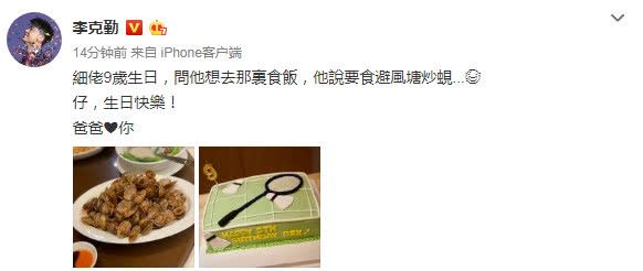 此外,身为爸爸的李克勤也不忘在这一天表达对儿子的爱,在微博中写到:“生日快乐,爸爸爱你。”而从李克勤晒出的庆生照来看,除了儿子喜欢吃的炒花甲之外,造型独特的生日蛋糕也成为一大亮点。