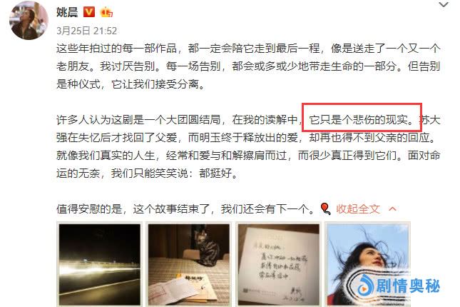 在大结局播出以后,作为《都挺好》的女主角,姚晨在微博上发表了自己的感想。对于这部电视剧,作为观众来说大结局迎合大部分人的想法,觉得大结局就应该朝着这个方向走。但是在姚晨的解读中,这只是一个悲伤的现实,在这一刻大家似乎才恍然大悟,姚晨的这句话其实说的不无道理。