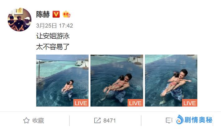 继前段时间陈赫在微博晒出一家人同游迪士尼的照片后,在3月25日,陈赫又在微博中分享了一则他和家人一起外出旅游的消息,陈赫这次又只是晒出了三张女儿的背影照,并且发文写道,让安姐游泳太不容易了,原来当天是陈赫在亲自教女儿游泳。