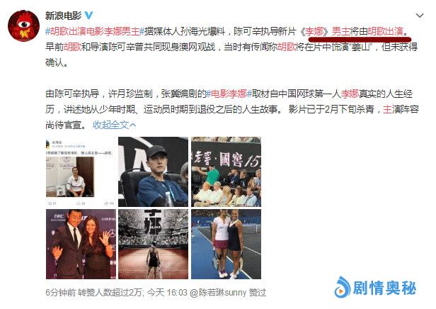 其实《李娜》电影早前就有网友拍到胡歌和导演陈可辛还被拍到曾一同现身澳网观看李娜赛事。那时网络就传开胡歌将出演“姜山”的消息,不过这个消息并没有得到官方的证实。如今胡歌确认出演《李娜》男主“姜山”一角,不少网友和粉丝都觉得导演太会挑人了,还有粉丝称:导演眼中的姜山真的帅气。粉丝们都表示有胡歌在一定追!