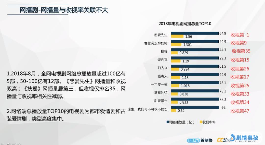 许多在收视排行榜上表现不理想的作品,网络播放量都相当靠前。而收视前十的电视剧中,仅有两部进入网播量前十。随着互联网的内容题材选择渐趋年轻化,电视收视和网播量的数据差异越来越明显,关联性也在逐步减弱。