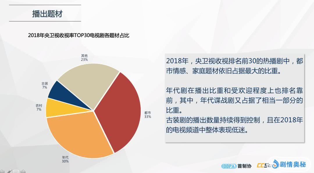 尹鸿指出,从2018年的数据来看,平台的不同造成了题材选择上的较大差异。整体来看,在收视排名前三十的热剧中,都市剧以33%比例占据首位。但对比央视和卫视的剧目可以发现,央视以年代、农村和革命历史题材为主,而卫视上,现实题材占比最重,都市情感剧也有所提升。