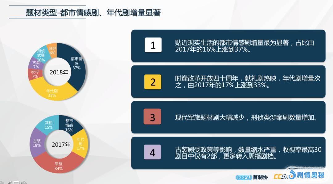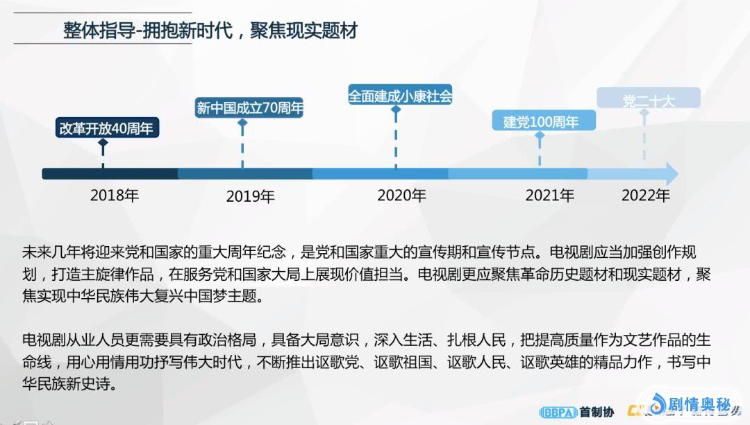 除了促进,未来的关键词还有引导。随着重大历史节点的靠近,未来几年,不光电视剧题材要依据历史节点进行规划,各平台也需要配合重大节点提供剧作。因此,从2018年开始,献礼剧开始出现在屏幕上。其中,《大江大河》《正阳门下小女人》在口碑和收视上,都有不错的表现。