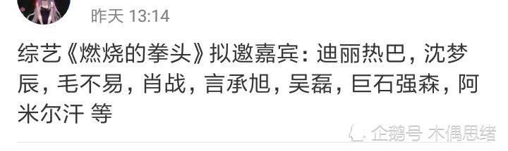 这档综艺一看名字就知道是有关于力量型的节目,也是比较有创新看点的。而节目拟请的嘉宾阵容名单,也都是非常具有知名度的艺人,像迪丽热巴、肖战、毛不易、沈梦辰、吴磊、言承旭,以及阿米尔汗、巨石强森等。