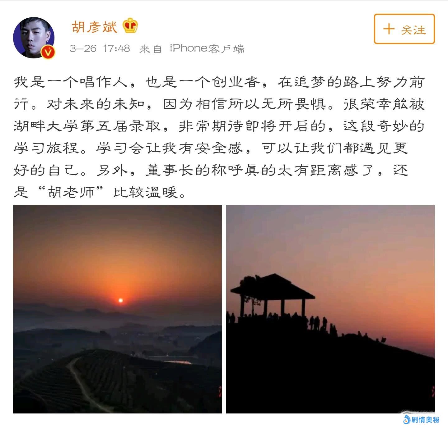 而对于自己被湖畔大学录取的消息在网上引起的轰动,他本人也在微博中做出回应,其微博原文如下:我是一个唱作人,也是一个创业者,在追梦的路上努力前行。对未来的未知,因为相信所以无所畏惧。很荣幸能被湖畔大学第五届录取,非常期待即将开启的,这段奇妙的学习旅程。学习会让我有安全感,可以让我们都遇见更好的自己。另外,董事长的称呼真的太有距离感了,还是“胡老师”比较温暖。