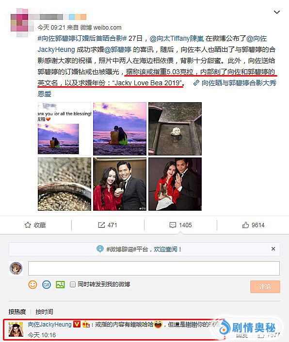然而,在向太公开向佐求婚郭碧婷照片的同时,网上又爆料称求婚戒指是来自知名珠宝品牌,引起粉丝们“同款”购买。据爆料称,戒指重5.03克拉,内部刻了向佐与郭碧婷的英文名,以及求婚年份“Jacky Love Bea 2019”。但没多久,求婚男主角向佐上线在评论区留言:“戒指的内容有多哦,但还是谢谢你的祝福,”这样本尊亲临了澄清在娱乐圈活久见。