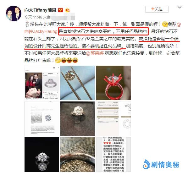 作为“葵花夫妇”的头号cp粉,向太继疯狂点赞后,再次亲自上线打假,在微博上发表了一大段文字进行辟谣。她表示钻石是直接找钻石大供应商买的,不是任何品牌,并称此颗钻石是全美之中的最完美的,戒指托则是香港一名低调的设计师送的。