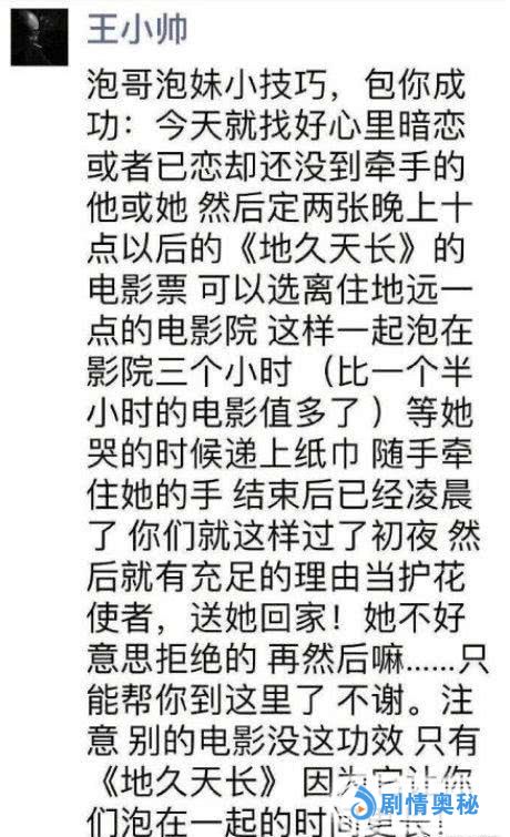 更过分的是王小帅还在朋友圈称看《地久天长》可以泡妹。他在朋友圈写到,先买两张十点以后的《地久天长》电影票,然后看三个小时电影,电影看完之后大半夜了,男生可以当护花使者送女生回家,女生不好意思拒绝,然后。。。这啥意思?难不成看场电影还能有约P的功能吗?不少网友看到王小帅这样的宣传,更是对这部电影无感,就这水平真的是白瞎了影帝影后了。也许是网友的争议声太大,王小帅之后又发微博称自己不适合营销,只是想让大家都看看这部电影。