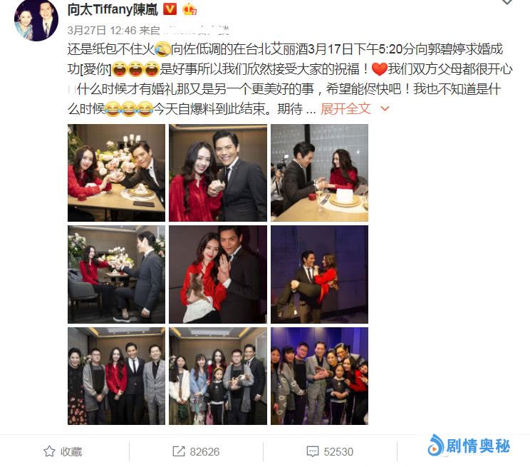 3月27日,向佐跟郭碧婷这对小情侣,被媒体曝光了已经订婚的消息,这让大家纷纷猜测两人的好事是否将近了。而在该消息曝光不久之后,向佐的妈妈向太陈岚肯定了这个消息。她发博更新了自己的动态,宣布了儿子向佐成功求婚自己的最中意的准儿媳妇郭碧婷,这也就意味着凉热好事将近啦。