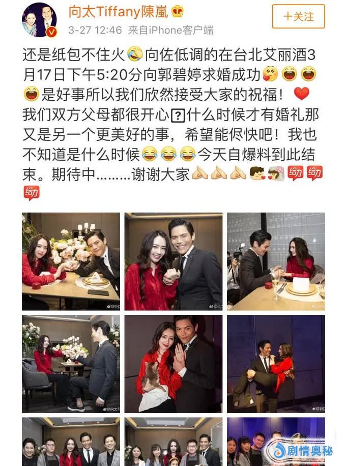 从很多迹象来看,向太才是她的脑残粉啊。如今向左也求婚成功了,之前传出也只是拍到的消息,而这次确实向太亲自晒照啊,并且公开了这个消息。其次到了最后,却看出了一种向太在催婚的感觉。并且还用期待中来表达自己催婚的想法,晒出的众多求婚现场合照,也是甜到腻。