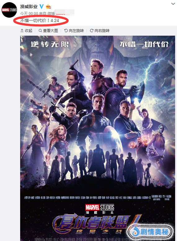 我们知道复联3是去年4月27号在美国上映,而将近之间相差了半个月之后才在中国大陆上映,而复联三的票房在全球是20.45亿,在北美的票房是6.78亿,但是在中国的票房就已经占到了差不多20亿的现象。但是在昨天凌晨的时候漫威宣布了《复仇者联盟4》建档时间是4月24日在中国内地上映。