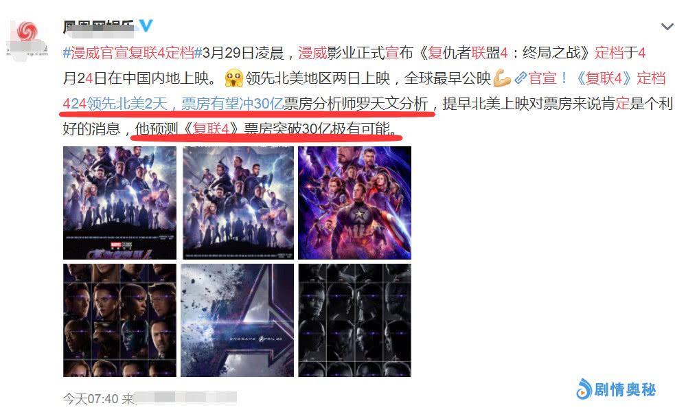 这个上映时期领先北美地区两日上映的,而且还是全球最早公映的,所以我们对这样的安排非常喜欢,在《复仇者联盟4》定档之后,被票房分析师罗天文分析,《复仇者联盟4》有望冲破30亿。虽然这样的一个票房令大家很满意,在前两天的《惊奇队长》刚突破10亿,所以大家对这个反响也是非常期待的。