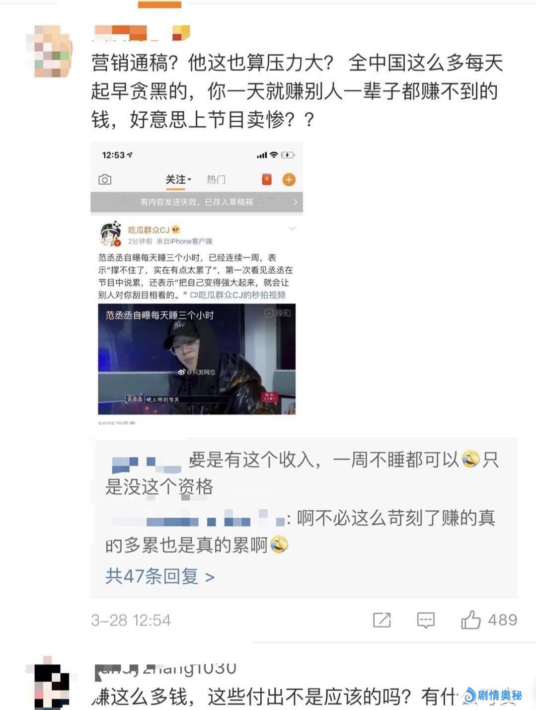 也正是因为工作量太大,所以范丞丞在节目中表示自己很累,很忙,经常会脆弱,想要让自己变得更加坚强,才会让别人对自己刮目相看。已经好几天没有睡觉了,也只睡了三四个小时。粉丝看到这段的时候都会特别心疼,他才十八岁就需要经受这么多的工作,这么累,但是,粉丝心疼,路人却并不买账,而且还被大家吐槽了,说是有点卖惨的嫌疑。