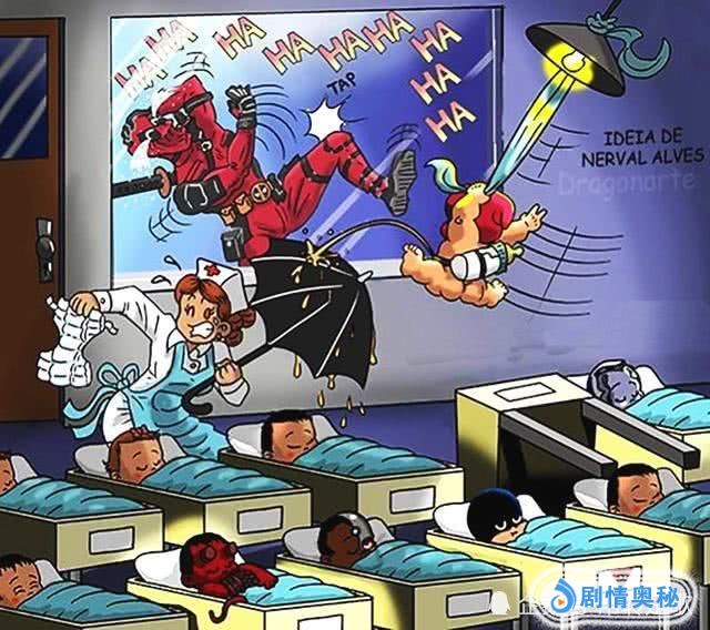 不过最恶搞的还要数死侍的儿子了,小的时候就调皮捣蛋,不仅把床踹翻了,还对着护士姐姐尿尿,以后想起来估计要羞愤致死吧,看看这个无良的老爸,在窗户外面笑的眼泪都出来了。