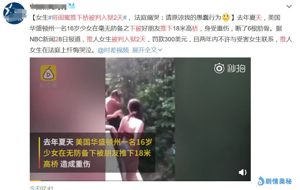 事情的原因是在一年之前,去年夏天的时候,这位女孩被自己所谓的闺蜜把自己的生活全部毁了,当时他们都在桥上玩,虽然穿的非常的暴露,想要去下水,可是在自己毫无防备的时候,闺蜜全部直接把她从18米的桥上推下,在她没有任何准备的前提之下,就直接被自己的闺蜜推下了桥,在当场控诉她的闺蜜的时候,女孩泣不成声,只能由身边陪伴的人把剩下的话说完,少女说自己断了6根肋骨。