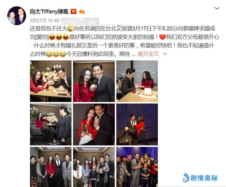 在这件事情中,火的还不仅仅是他们两人好事将近,还有向太陈岚也火了一把,本来3月17日就求婚成功了,不过外界一直都不知道,消息被曝光了之后,向太便按耐不住心中的喜悦,自己官宣了儿子求婚成功的喜讯。