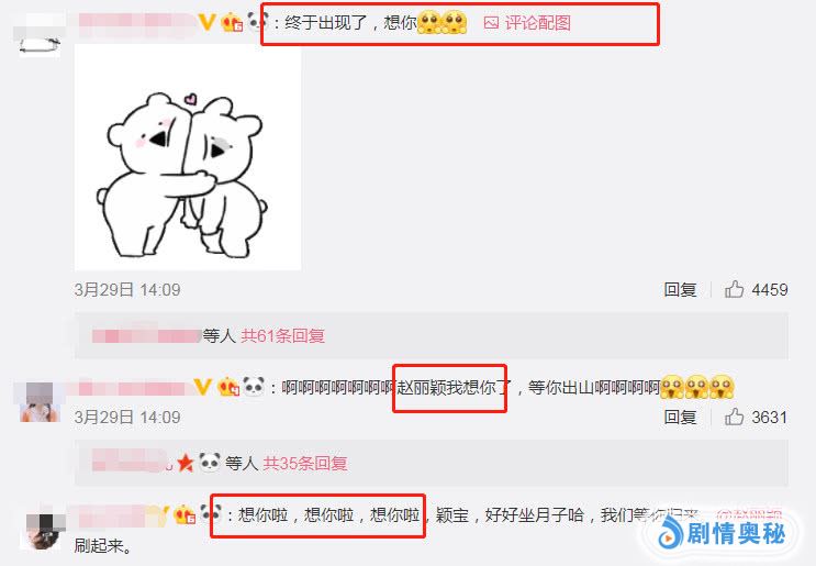 而想念赵丽颖的粉丝,在看到赵丽颖终于更新了动态之后,虽然说没有看到赵丽颖本人,但是他们还是很激动的在微博的评论区表达了自己爱豆的思念:“想你了”、“终于出现了”、“终于等到你了!”等等,虽然不是生活动态,但是粉丝依旧还是十分高兴,一瞬间也收获了10万多的转发,跟10万多的点赞。