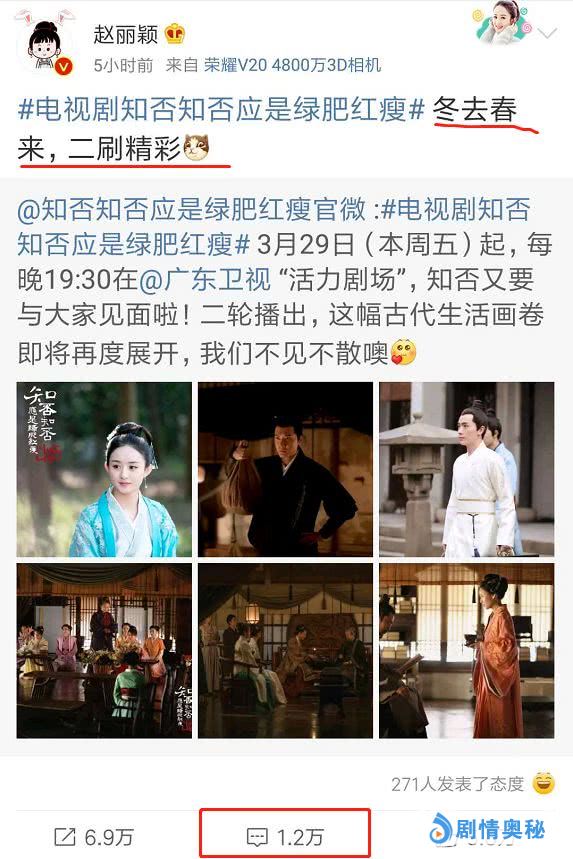赵丽颖转发的是电视剧《知否》官微所发的一条动态,内容为该剧在广东卫视复播的消息。据悉,电视剧《知否知否应是绿肥红瘦》,将于3月29日晚上7点半开启第二轮播出。而赵丽颖转发此博的目的,也是为了提醒大家“二刷”,准时收看此剧。