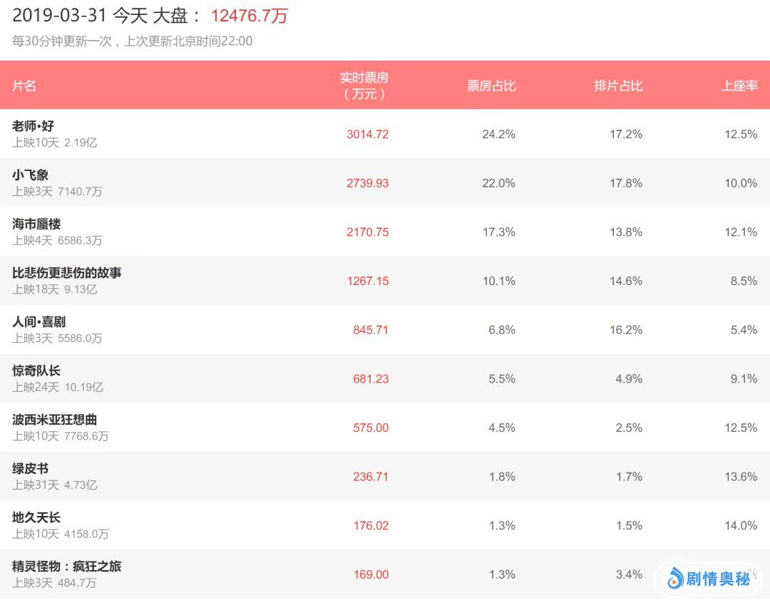 (数据来源猫眼专业版,截止至2019年3月31日22:00)