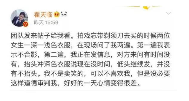 其实在娱乐圈中最为黑脸而且跟粉丝互撕的便是之前咱们熟悉的“大学教授”翟天临了,作为这位品学兼优的明星来说,之前在日本拍戏的时候,遇到内地的粉丝要求进行合影,却不想直接被翟天临以“没时间”而黑脸拒绝了。该粉丝后续在微博上发布称“翟天临黑脸”。但是翟天临之后的回应却也是让粉丝无奈: