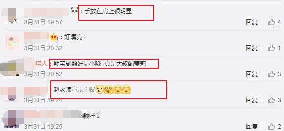 对此,网友也纷纷留言评论:“手放在肩上很明显”、“赵老师宣示主权”、“颖宝剧照好显小,真是大叔配萝莉。”