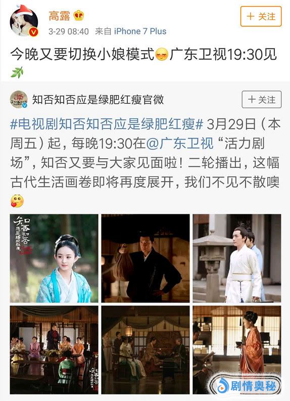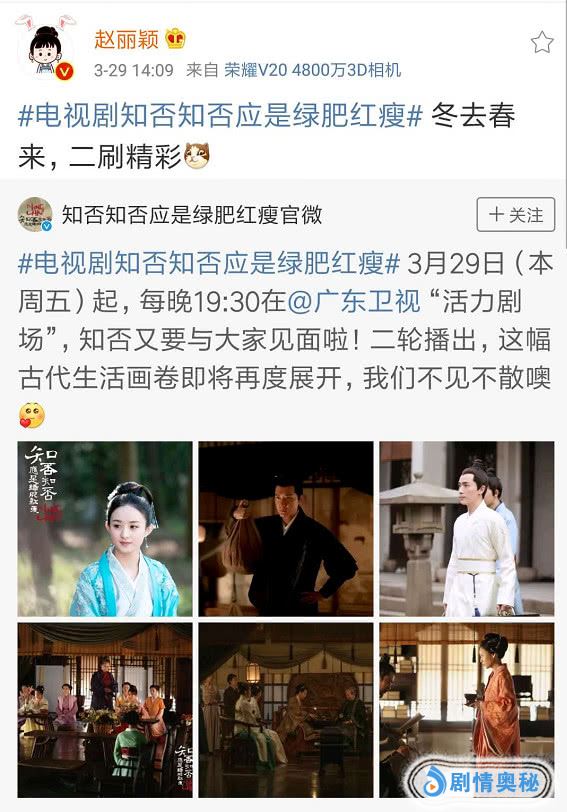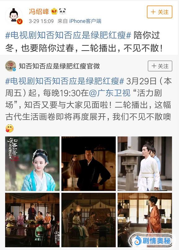 赵丽颖、冯绍峰以及高露三人之所以转发这条微博,其实是因为《知否》这部剧已经于3月29日当晚在广东卫视复播,也就是第二轮播出。三人作为这部剧的主演,自然会帮忙做宣传。很多喜欢《知否》这部剧的观众,又可以二刷此剧,并在剧中再次欣赏颖宝的精彩表现了。