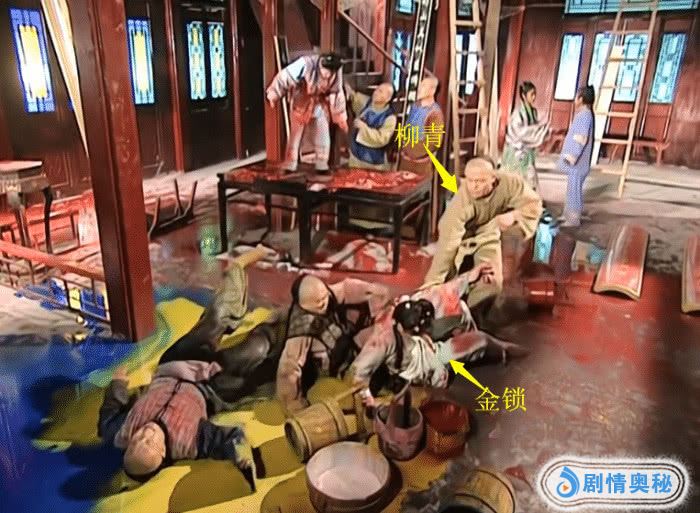 柳青站得离金锁最远,他却第一个冲上去扶金锁,可见此时柳青心里已经对金锁有意了。这是整部《还珠》系列中第一次表现出柳青对金锁的特殊态度。