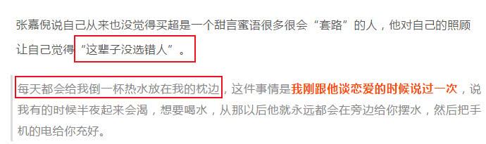 近日,和老公买超一起接受某档节目专访的张嘉倪,在采访中她也首次透露和买超在一起后每天都会为她做的一件事,张嘉倪表示:“刚跟买超恋爱的时候说过自己有时候半夜起来会渴,想要喝水,从那以后买超就永远都会倒一杯热水放在她枕边。”就是这样一件小事打动了张嘉倪,感慨表示:“这辈子没选错人。”