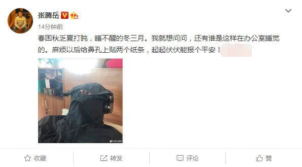 不知道是灯光太耀眼了还是如何,咱们的张震岳这个造型也是醉啦,酣睡中还听着音乐,一身黑色的衣服直接将面部遮掩的严严实实,只露出两个鼻孔,张震岳却也是配文道:我就想问问,还有谁是这样在办公室睡觉的。麻烦以后给鼻孔上贴两个纸条。如果鼻孔贴条的话,那么这个造型一定是更加雷人了,不过话说,张震岳的这鼻孔真的是很大的。春意浓浓,困了也是正常,但是除了张震岳这样自曝睡姿和睡相之外呢,还有哪些爱豆也有着让粉丝们大吃一惊的睡姿呢?