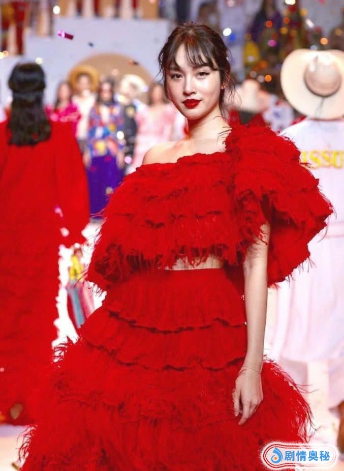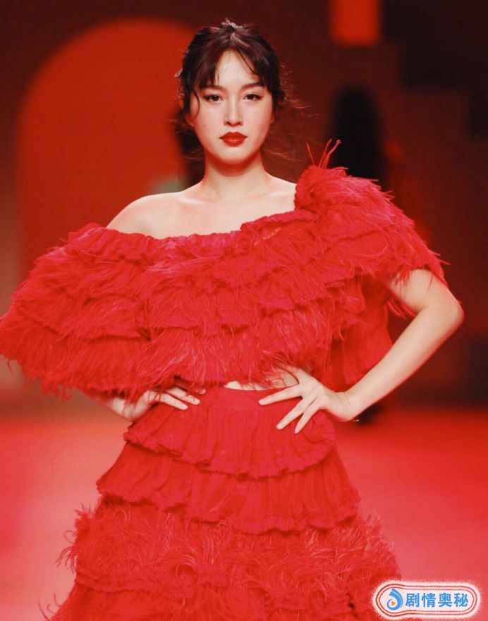 Poy穿大红裙走秀,她的裙子是比较显胖的,这样的裙子显得她更胖了,上面是一件一字肩的裙子,穿起来很大方,还有露腰的设计,勾勒出纤细小蛮腰,搭配的是红色流苏裙,也超级优雅的呢。