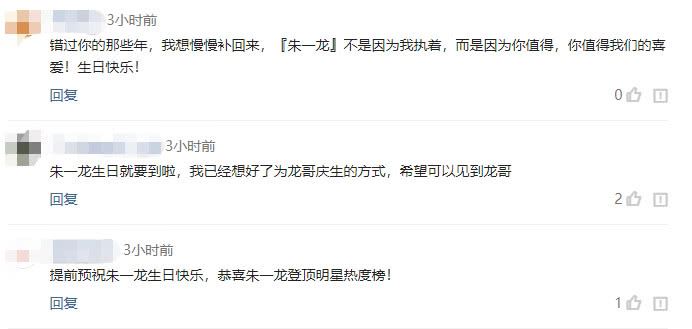虽然距离朱一龙31岁生日还有两周时间,不过粉丝已经想好了为朱一龙庆生的方式,有粉丝评论道:错过你的那些年,我想慢慢补回来,不是因为我执着,而是因为你值得,你值得我们的喜爱,生日快乐!有粉丝评论道:朱一龙生日就要到啦,我已经想好了为龙哥庆生的方式,希望可以见到龙哥。还有粉丝评论道:提前预祝朱一龙生日快乐,恭喜朱一龙登顶明星热度榜!