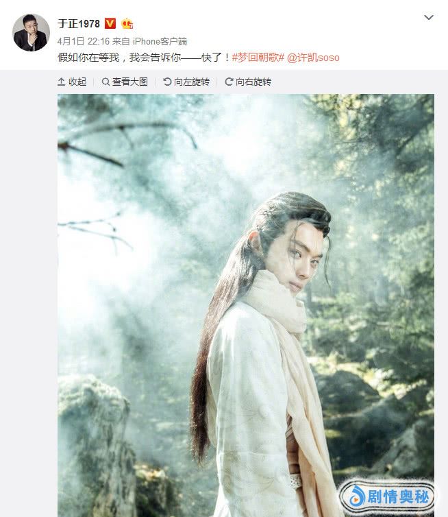 然而,近日,于正在网上的又一则与许凯有关发文再次引起了网友们的关注。只见于正在文中提到,假如你在等我我会告诉你快了,并备注上了朝歌这部剧。意思也就是说许凯眼下在继《招摇》之后的另一部剧就是《朝歌》了,而且这部剧很快就要播出了。相信许凯的粉丝们看到这个消息后也一定会非常开心吧,不知道网友们对这部《朝歌》是否期待呢?
