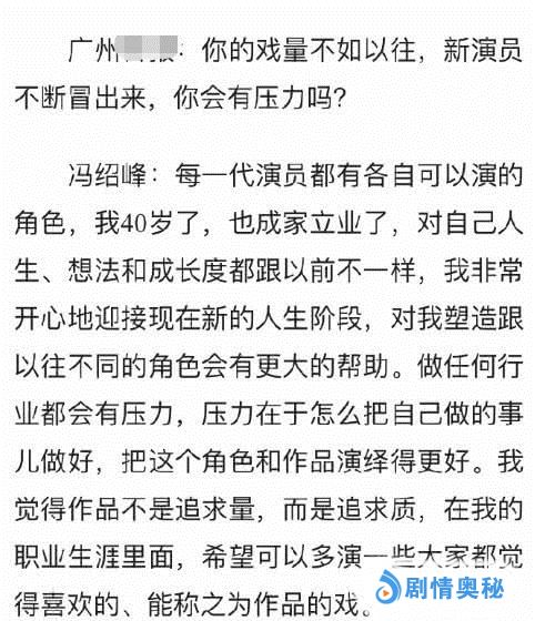 而对于《知否》之后为了照顾老婆赵丽颖和刚出生的儿子迟迟没有进入剧组拍戏以及没有新戏上线的冯绍峰,在采访中他也被问到戏量减少会不会担心被新演员超越而有压力。