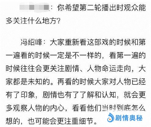 其中,在专访中被问到“希望二轮播出时观众能多关注什么地方?”冯绍峰也回应道:“再看的时候大家对人物已经有了印象,剧情也有了了解和认知,就会更多观察人物的内心,看看他们当时到底怎么想的,也可能会更关注细节。”