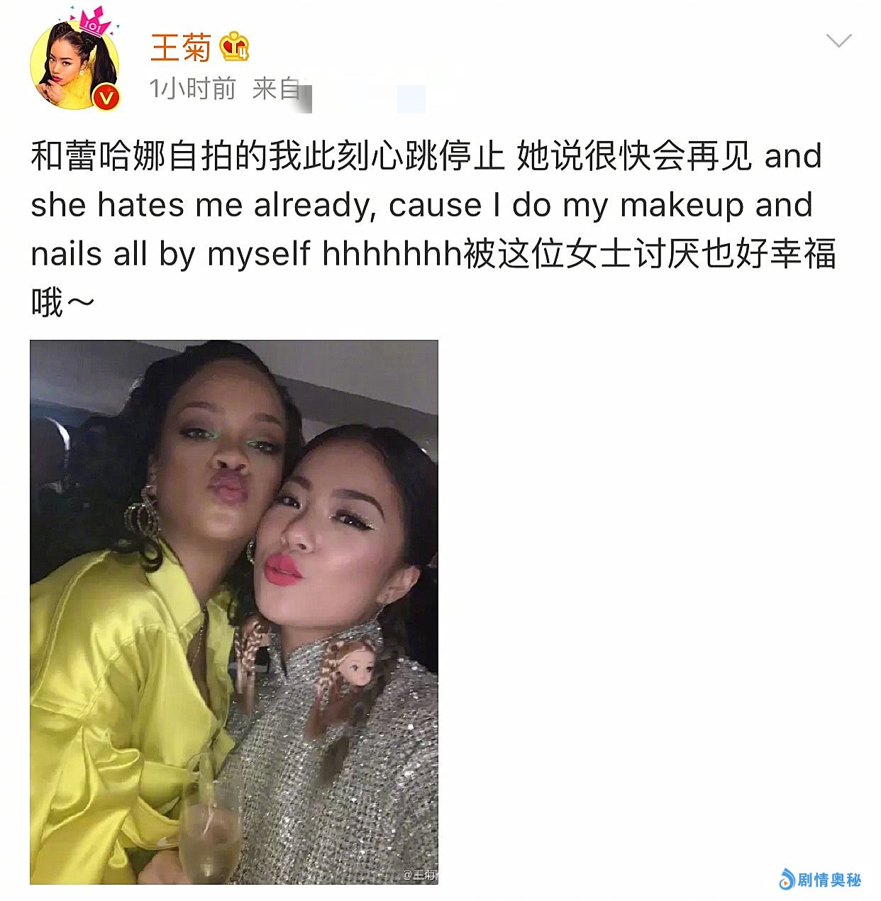 今天中午,王菊在微博上晒出一张与riri的合照,并称“和蕾哈娜自拍的我此刻心跳停止 她说很快会再见,她已经讨厌我了,因为我自己给自己化了妆还弄了指甲”,最后还补充了一句,“被这位女士讨厌也好幸福~”