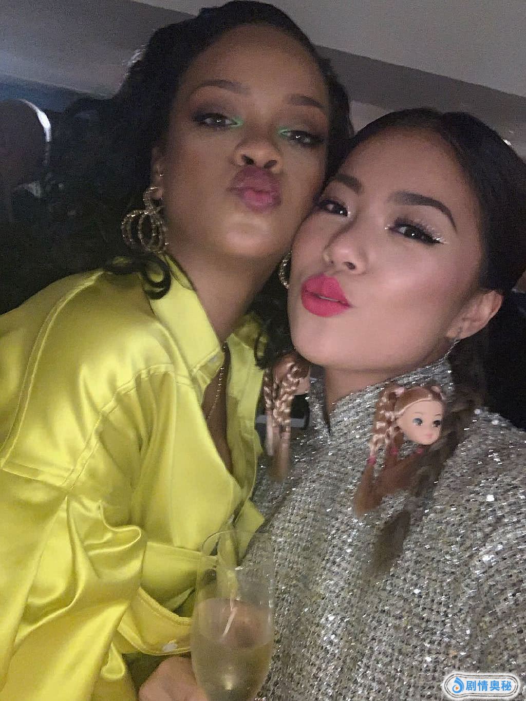 从照片来看,菊姐身穿一件中高领的银色旗袍风礼服,头发扎成两条麻花辫,显得年轻又俏皮。只见她跟蕾哈娜相拥,两人对着镜头嘟嘴卖萌,关系似乎很好呢~然而,大家的关注焦点却是菊姐的耳环!