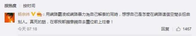 说要去自杀什么的,对此很多人也觉着好笑,说是为了火真的是不择手段了。直播人家父女,冤枉人家打人和骂人的时候,怎么不想想陈冠希也会被网络暴力呢?很多圈里的同行这次,也是站在冠希哥这边了,甚至还反问他。总结一下杨宗纬的话,那就是如果他真的不活了,会去给他上香。